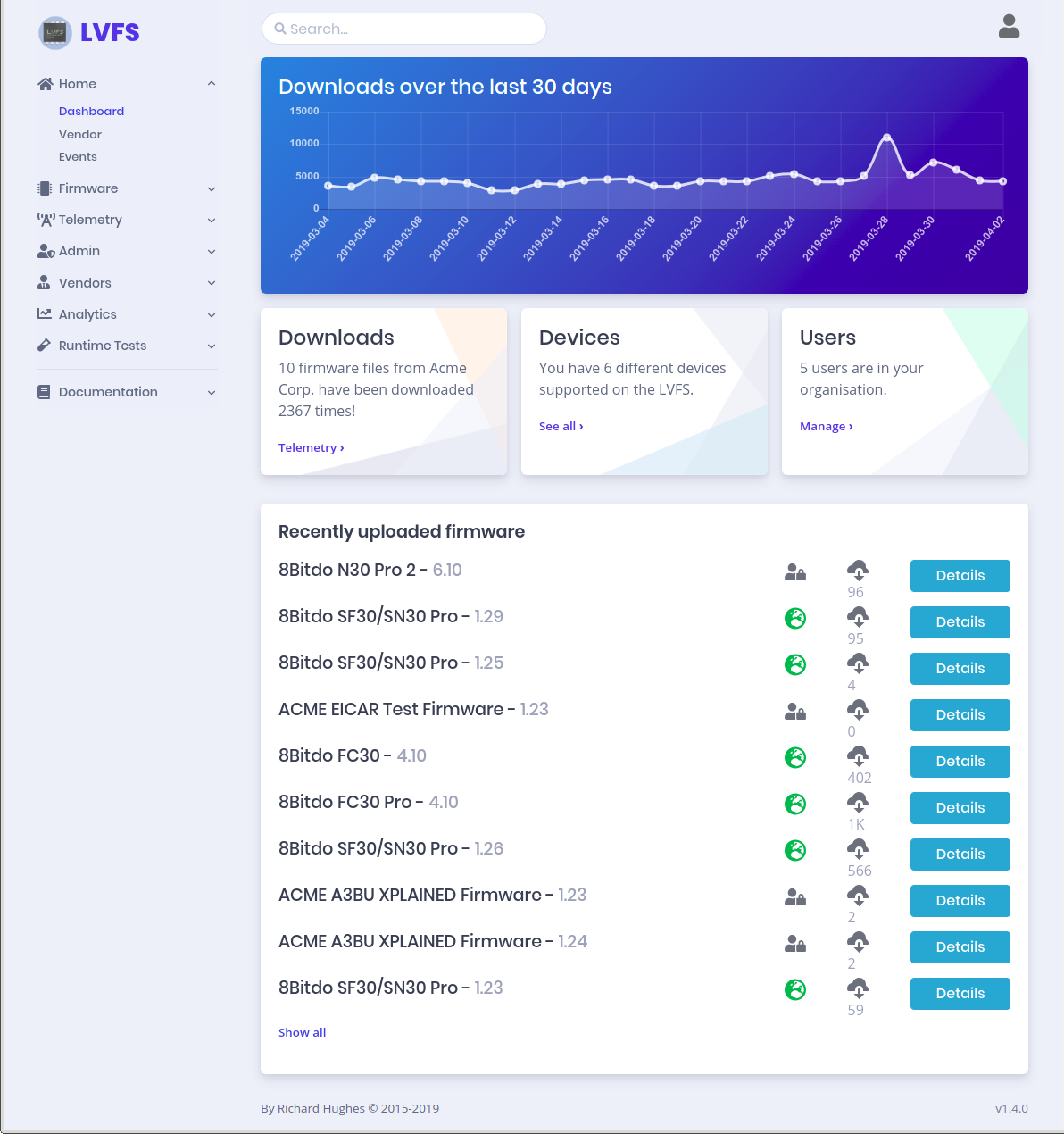More information »LVFS © 2015 Richard Hughes with icons from Font Awesome and GeoIP data from IP2Location.